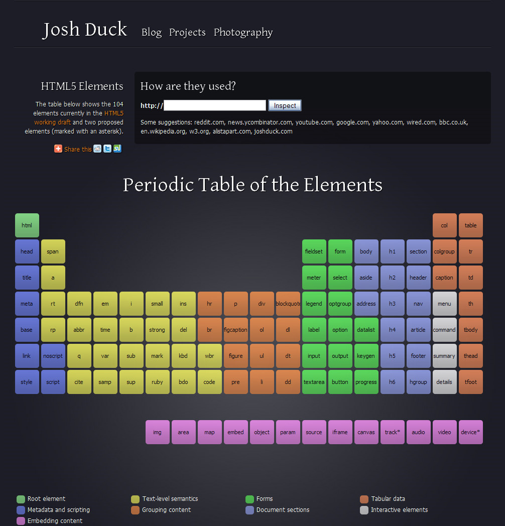 Una excelente representación gráfica—inspirada en la tabla periódica de elementos—ha concebido Josh Duck en su blog. La misma tabla contiene los 104 elementos que estás siendo tratados en el borrador de trabajo, más 2 elementos recientemente propuestos (que en la tabla están marcados con un asterisco).