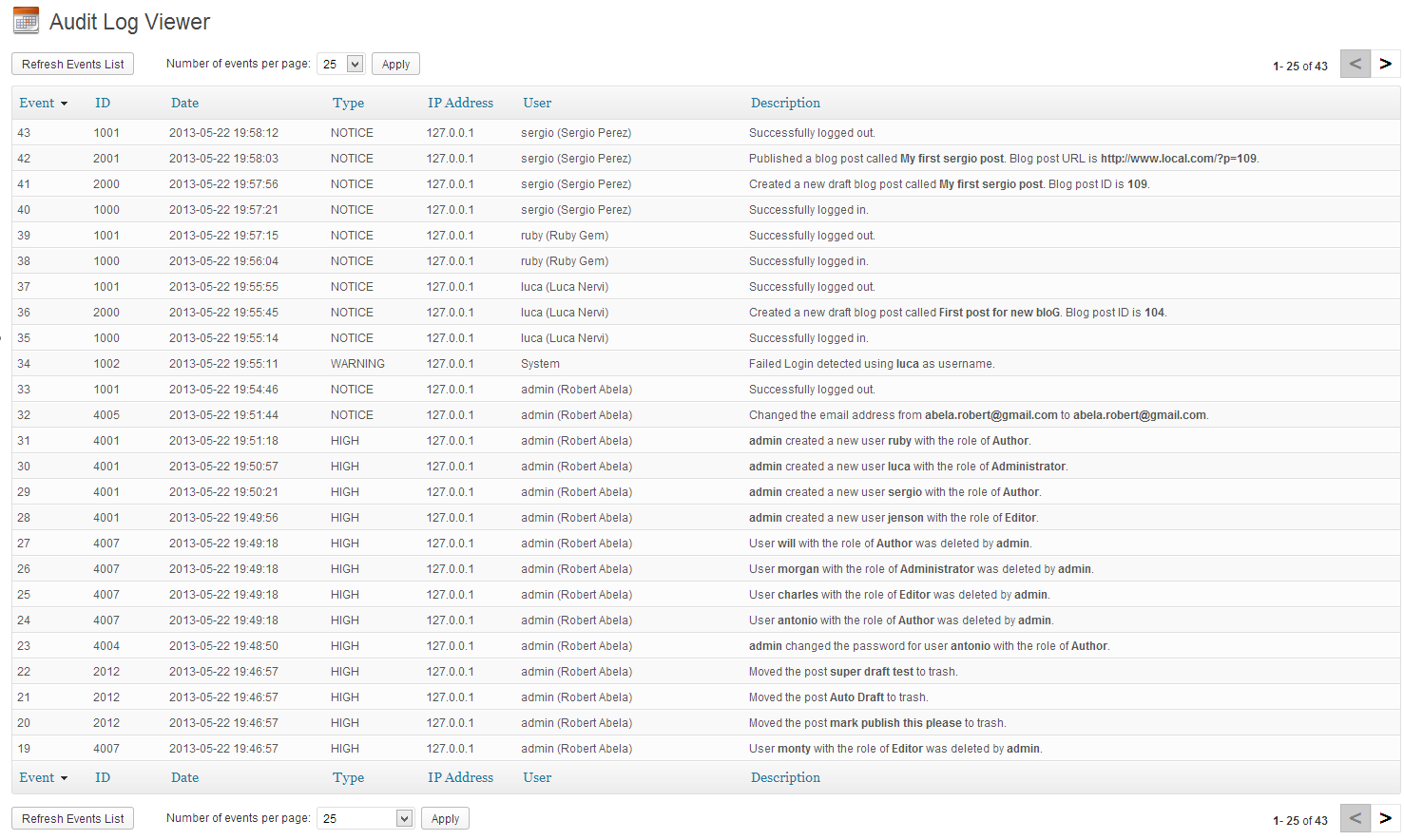 El registro de actividad es completo—es genial para sitios Web donde colaboran varios autores—ya que involucra desde actividades tan simples como algún cambio en la URL de un post como así nuevos elementos que son agregados a las bibliotecas de medios, por ejemplo.