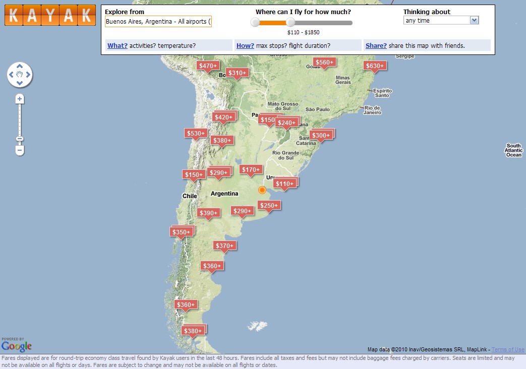 KAYAK es una aplicación Web que se apoya en la API de Google Maps, para permitir al usuario ubicar vuelos baratos a partir de una ciudad origen.